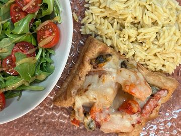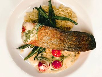 Garlic salmon in arugula tomato cream sauce with lemon basil orzo, green beans (GFO)